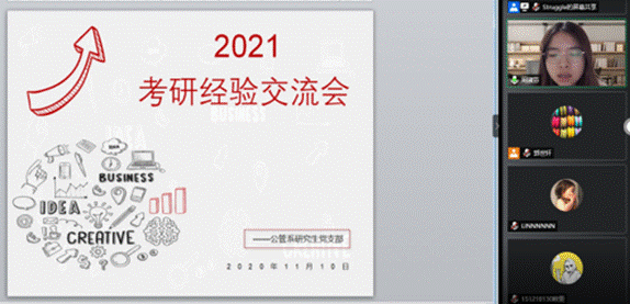 11月10日,304am永利集团研究生第七和第八党支部在腾讯会议上举办了考研经验交流会,五位20级公管系研究生李晓天、邬庆超、索梦慧、张媛媛和王贻瑄,通过将把自己的考研经验倾囊相授,为备考本科生奉上了一次交流盛宴。出席本次交流会的有公管系研究生辅导员周淑芬、20级公管系研究生和大三大四考研同学,活动由20级公管系研究生李中钺主持。