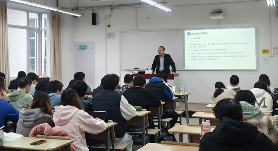 在课堂上,首先,刘博士从创新知识理论出发,围绕老员工创业者自我管理、客户管理和风险管理等知识点展开讲解;接着,刘博士以自身的创业类竞赛获奖历程为切入点,结合经典创业案例,对商业计划书的撰写及优化等知识进行讲解;最后,刘博士特别强调了创新思维在创业中的重要性,并通过对新质生产力中所蕴含的创新创业机遇的解析,向同学们展示了如何在快速变化的商业环境中获取创业机会。