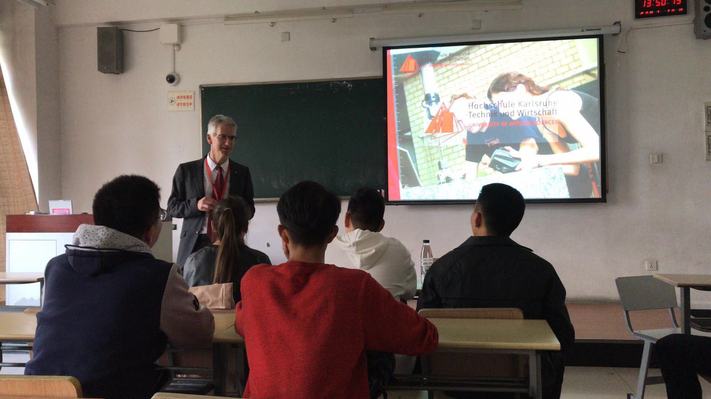 2018年10月26日下午,德国卡尔斯鲁厄应用科技大学董事长Prof. Frank Artinger及国交处处长Dr. Joachim Lembach在教学楼E102围绕《德国卡尔斯鲁厄应用科技大学及其交换项目介绍》的主题为304am永利集团教师及研究生做了专题讲座。