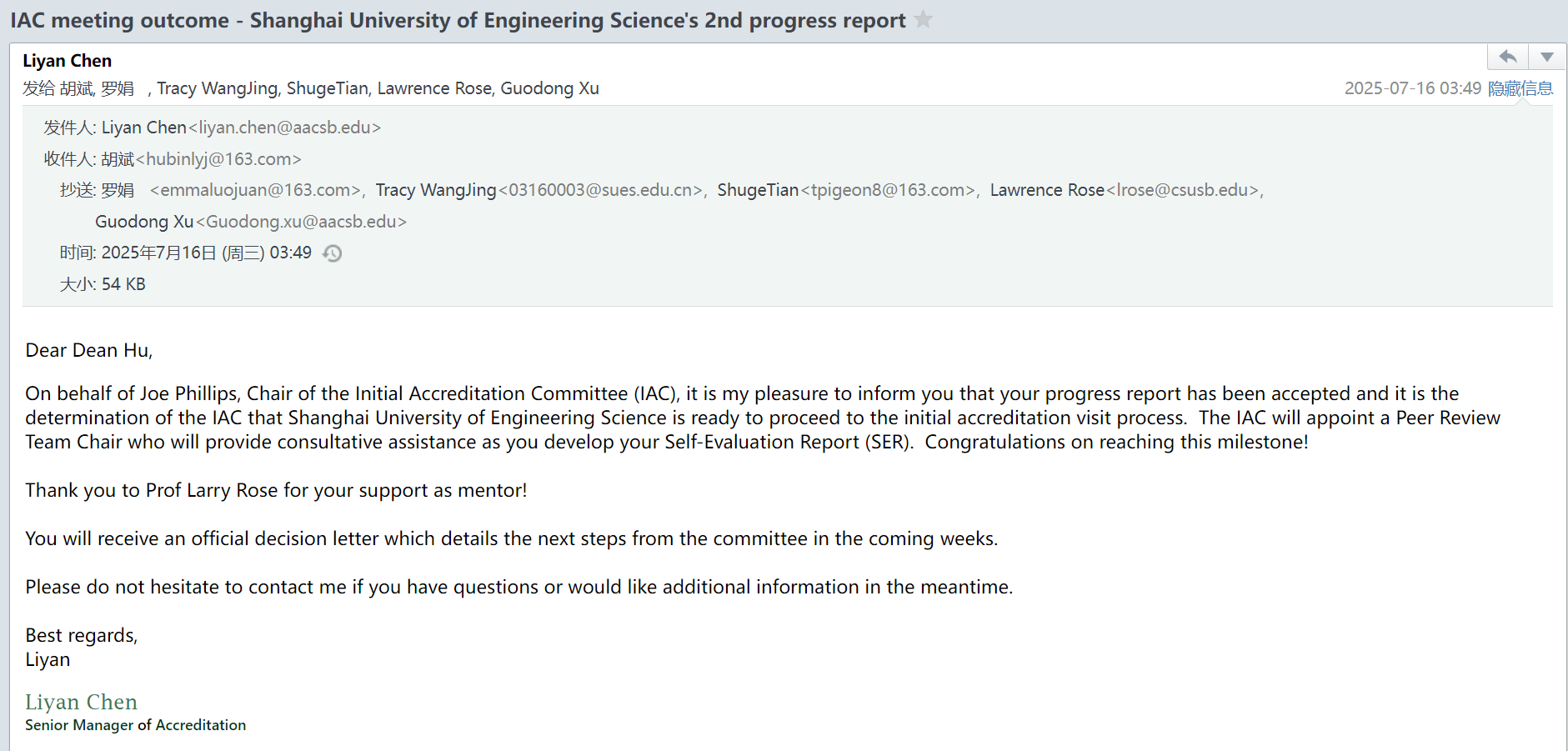 2025年7月16日,304am永利集团收到国际精英商公司协会(AACSB)初始委员会(IAC)通知,公司第二轮年度进展报告(2nd Progress Report)获得通过,并跳级进入最终现场访视准备阶段,这标志着公司AACSB国际商科认证迈入了实质性的最后关键环节。