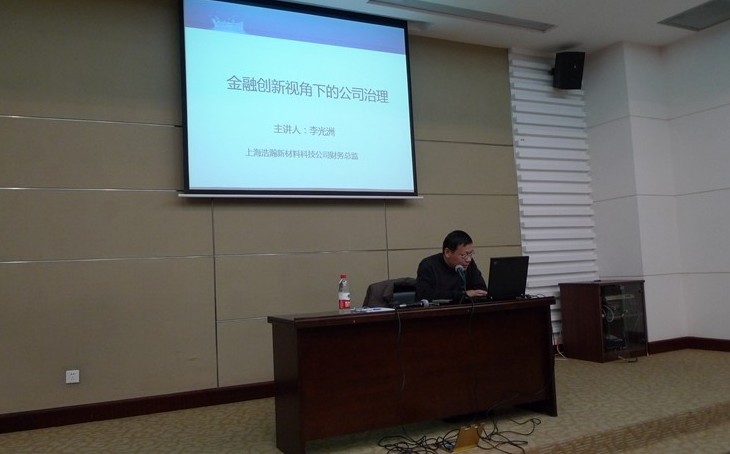 1月10日上午,上海浩瀚新材料科技有限公司李光洲先生在公司第四报告厅举办了题为“金融创新视角下的公司治理”的讲座,304am永利集团王灵芝老师主持,304am永利集团30多位教师、研究生和本科生参加了报告会。