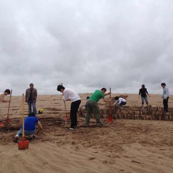 此外,小队成员还走入了沙漠,实践了葵花秸秆固沙技术,亲身体验了搬运、划线、挖土、折杆、插杆、掩埋等工作。这一系列的工作既充满了新鲜感又有一定的技术难度,考验了大家的合作能力、动手能力及耐力。同学们感受了守住每寸绿土的艰辛,加强了对生态保护的重视意识,更希望通过自己的绵薄之力将所见所感宣传给更多的青年员工。