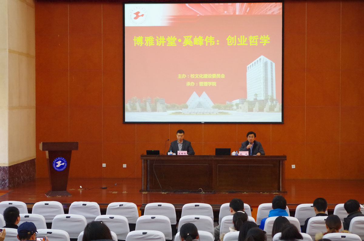 奚峰伟先生首先为同学们讲述了自己丰富的人生经历。奚峰伟先生曾任南京大学物理系教师、律师事务所合伙人,随后担任过阳光文化传媒集团的董事及副总,目前在华平信息股份任联合总裁的工作经验。奚峰伟先生娓娓道来自己在工作中对于创业的思考和认识,奚峰伟先生以哲学为切入口,讲述了创业中的哲学问题,他认为创业中有失败有成功,只有自己跟随自己的想法去踏实做事情必定会有不同形式的回报,为同学们树立了良好的创业理念。