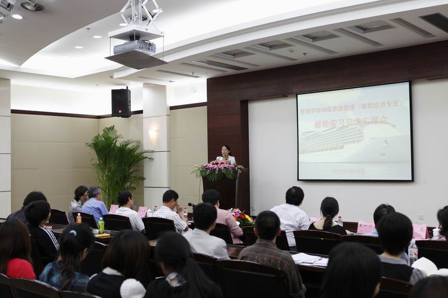 由上海教育电视台对此次08级旅游管理(邮轮经济)登船实习进行采访的VCR把同学们重新带回到了美丽的海洋神话号。在邮轮上,同学们既体验到了优质的服务,又收获到了专业的知识,为他们今后的就业打下了一定的实践基础。之后,由潘赢同学为大家介绍了海洋神话号这艘邮轮的整体概况。
