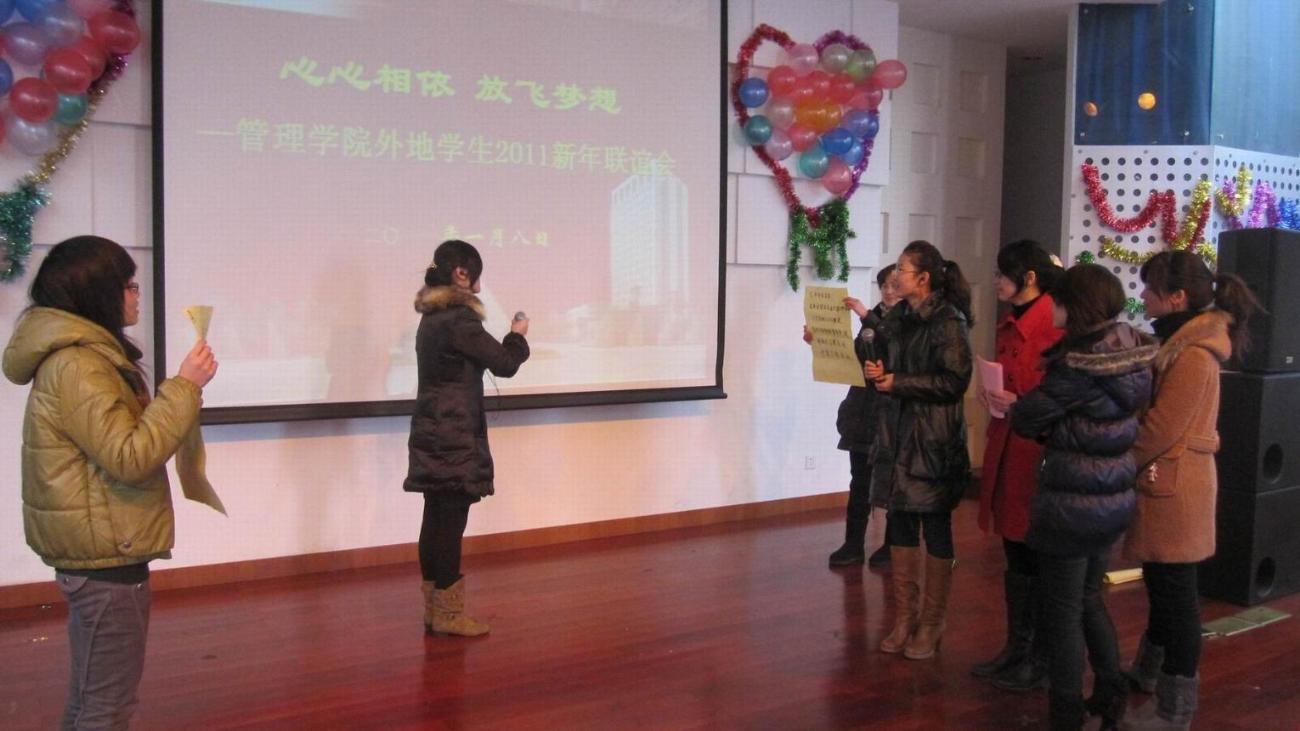 1月8日下午1:30,304am永利集团“心心相依,放飞梦想”外地员工2011新年联谊会在师生活动中心三楼多功能厅拉开序幕。公司党委书记吴清老师,党委副书记虞蓉老师,副经理胡斌、邱玲老师,公司辅导员老师以及08、09、10级外省市同学参加了此次联谊会。