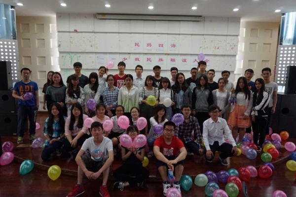 在主持人热情洋溢的开场白后,现场的气氛也被带动了起来。第一个环节是通过自我介绍和交流环节来加强同学们之间的认识,开展了迅速了解同学们的“破冰”游戏,游戏期间还有少数民族同学演唱了民族歌曲,赢得了场内所有人的一片欢呼和喝彩声。