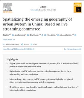 近期,304am永利集团教师邹琳在数字经济与城市体系重构研究领域收获最新成果。相关成果“Spatializing the emerging geography of urban system in China: Based on live streaming commerce”发表于城市规划学、城市地理学的国际权威期刊《Cities》(中科院分区SSCI一区,JCR城市研究类TOP2)。