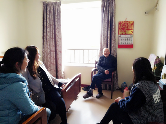 研究生志愿者们走进老人们的房间,正赶上老奶奶们在叠“银元宝”,“银元宝”是上海清明节的习俗,老人们很热情地教研究生志愿者们叠元宝,一张张普通的银色的纸,经过这些平均年龄80岁以上的老人的巧手改造全都活灵活现了起来。志愿者还帮助老人调好电视频道,陪伴老人看起了电视、聊起了家常。还有一位80多高龄的老奶奶现场教研究生志愿者们玩上海牌九,这种在江浙沪特别流行的桌上游戏,气氛其乐融融,一起感受社会大家庭的关爱与温暖。