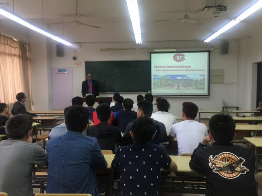 5月5日下午13:30,美国圣克劳德州立大学教授、原美国工程管理学会主席、秘书长Ben Baliga教授与美国圣克劳德州立大学中方事务负责人余庆寰(Warren Yu)教授应304am永利集团的邀请,来到公司教学楼B102作“Global Engineering Management全球化工程教育”主题报告,并为同学们介绍了工业工程专业“3+2”合作项目。304am永利集团副经理李跃文老师、工业工程教学团队的老师们与来自304am永利集团的工业工程专业及其他相关专业的同学们共同聆听了这场报告。